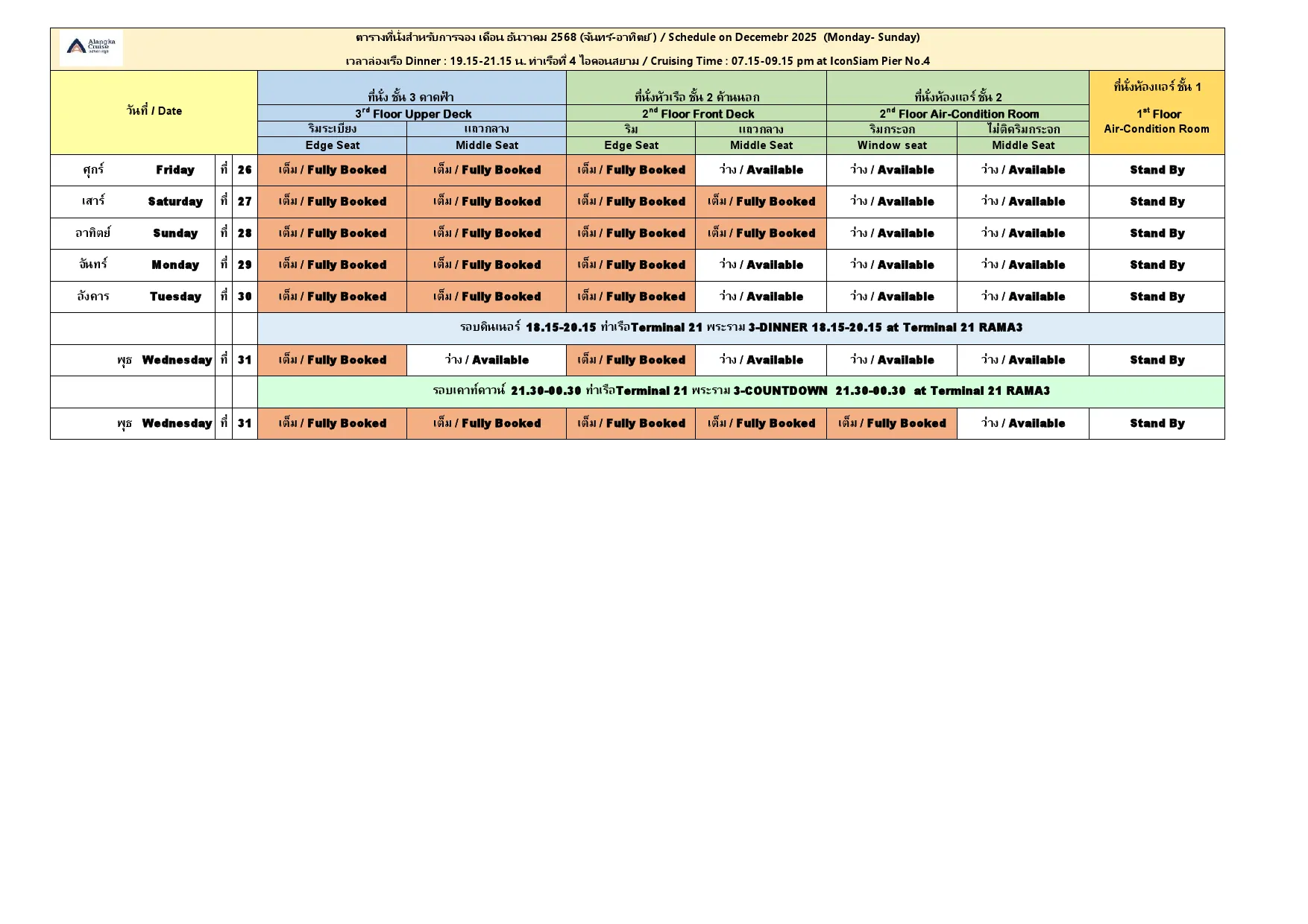 - ตักอาหารที่ดาดฟ้าหรือชั้น 2 - พื้นที่จะค่อนข้างแคบ - บางช่วงเวลาลมพัดแรง - ฝนตกจะย้ายไปที่ห้องแอร์ |