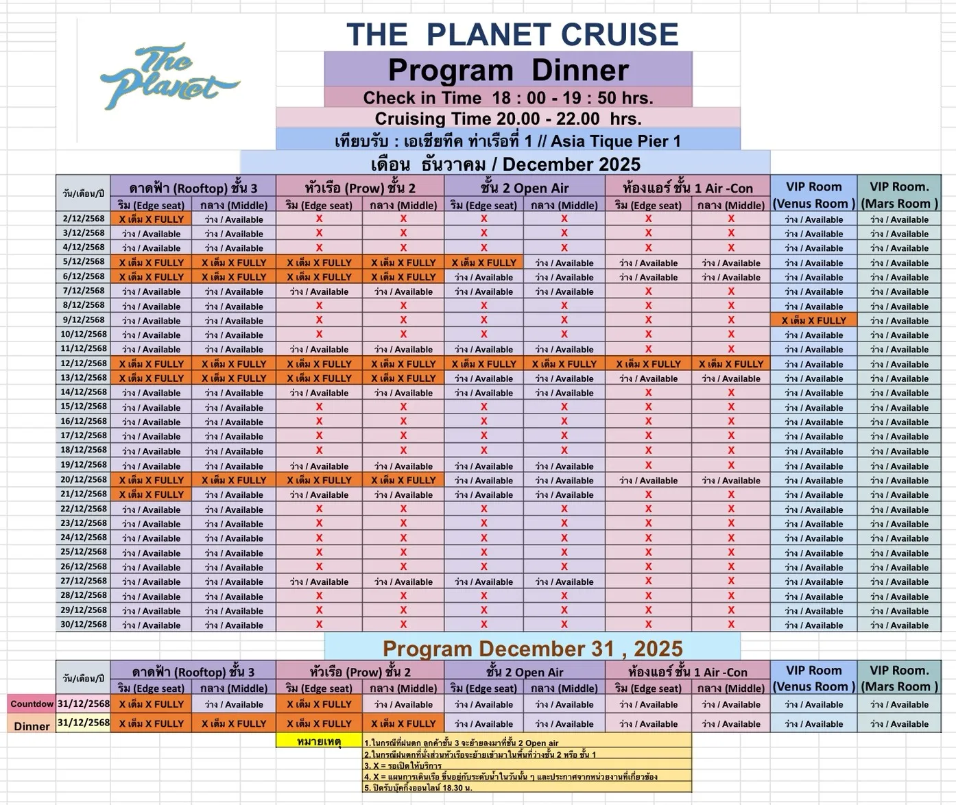 เดอะแพลนเน็ต ครูซ (The Planet Cruise): เปิดให้บริการทุกวัน ตั้งแต่เวลา 18.00 น. - 21.30 น. ระยะเวลาในการล่องเรือเจ้าพระยา 2 ชั่วโมงเต็ม