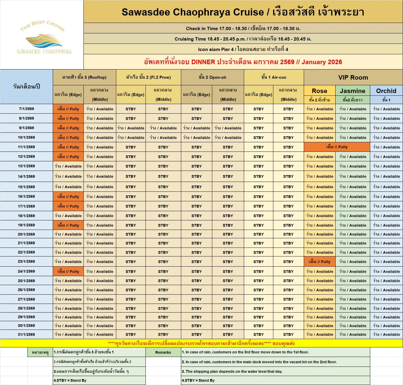 | 1. จองง่าย รวดเร็ว ได้บัตรเข้าชมเลยทันที 2. ราคาถูกกว่าซื้อที่หน้าเคาเตอร์ของเรือดินเนอร์ 3. สามารถเลื่อนวันได้ฟรี!ก่อนเวลาล่องเรือ 4. จ่ายบัตรเครดิตฟรี! ไม่มีค่าธรรมเนียม 5. ใบอนุญาตประกอบธุรกิจนำเที่ยว: 14/04385 |